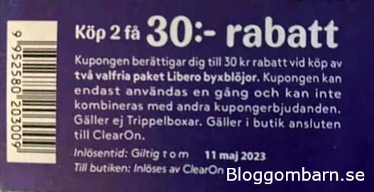 Kupongen berättigar dig till 30 kr rabatt vid köp av två valfria paket Libero byxblöjor. Giltig till och med 2023-05-11.