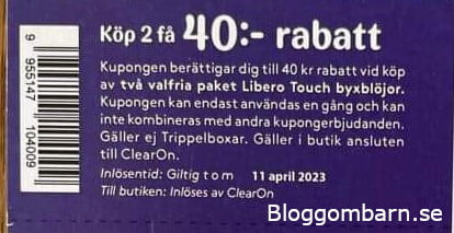 Köp valfritt paket libero byxblöjor och få 25 kr rabatt. Utgångsdatum ej angivet på kupongen, då den delen blev avklippt. Men, datumet är till och med 2022-12-31.