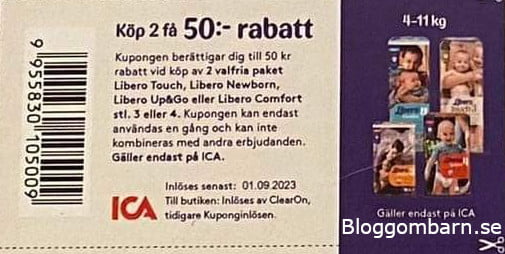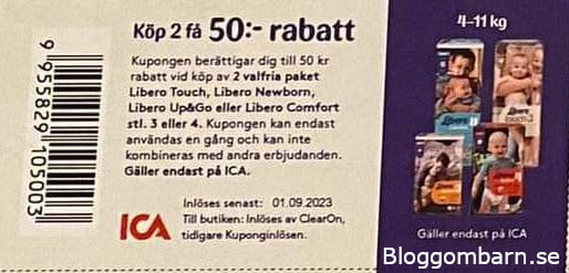 Köp 2 får 50 kronor rabatt. Kupongen berättigar dig till 50 kr rabatt vid köp av 2 valfria paket Libero Touch, Libero Newborn, Libero Up&Go eller Libero Comform strl. 3 eller 4. Gäller endast på ICA. Inlöses senast: 2023-01-25