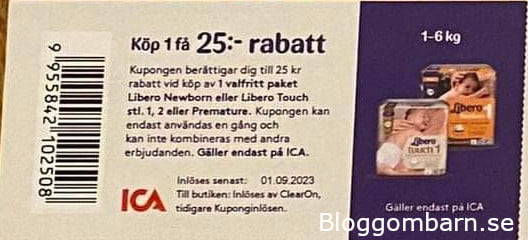 Kupongen berättigar dig till 25 kr rabatt vid köp av ett valfritt paket Libero newborn eller Libero touch storlek 1, 2 eller premature. Rabatten gäller på ICA. Giltig till och med 2023-09-01.
